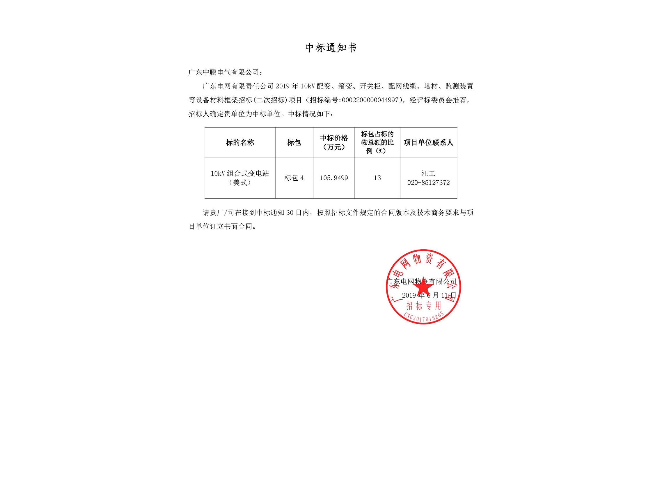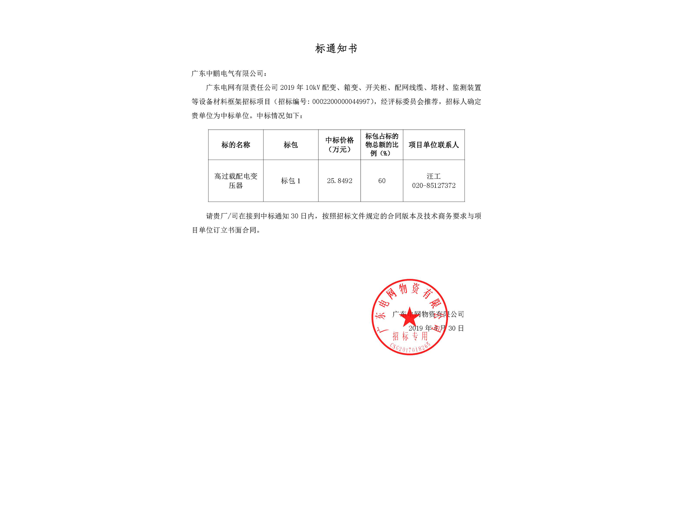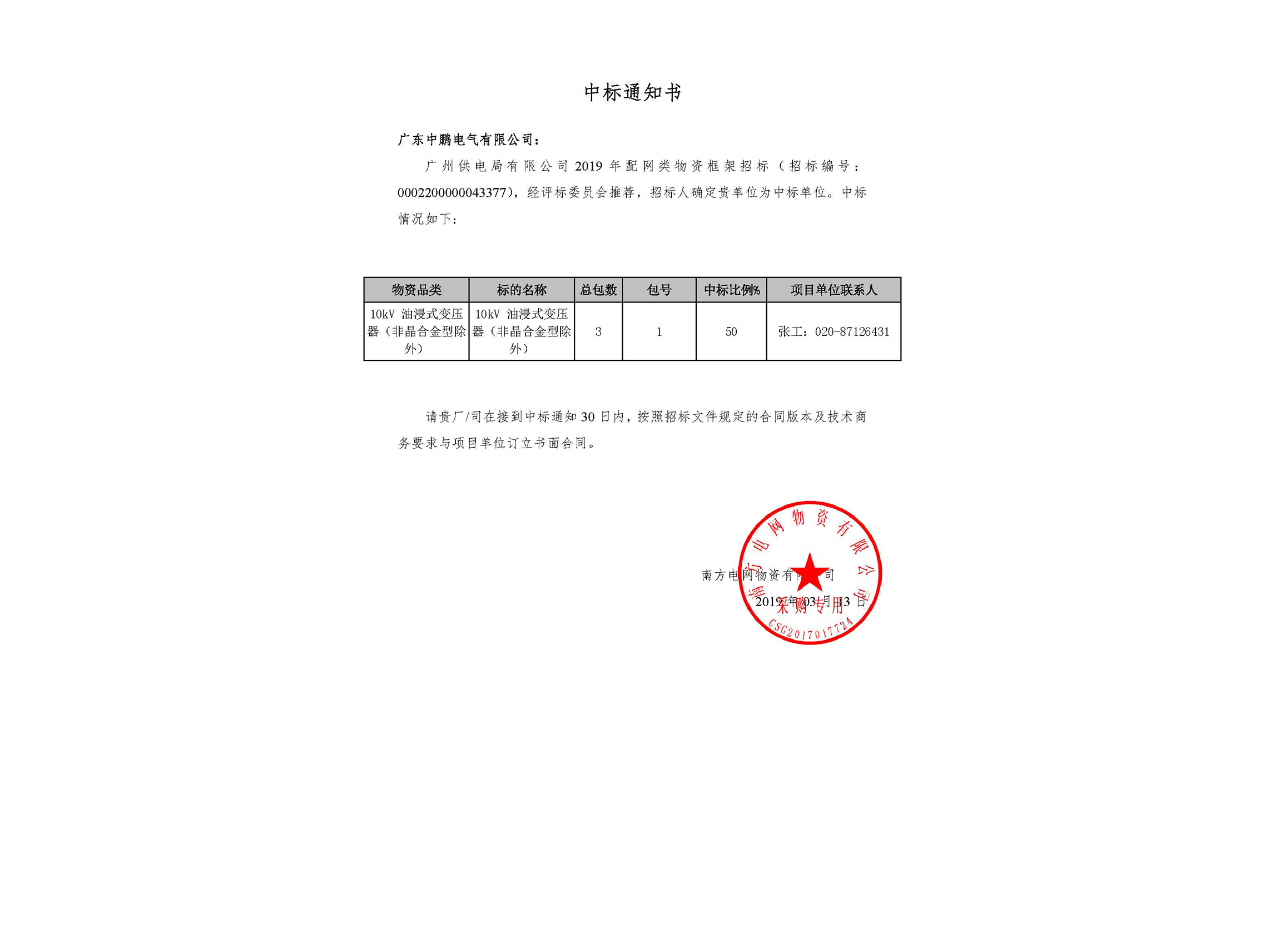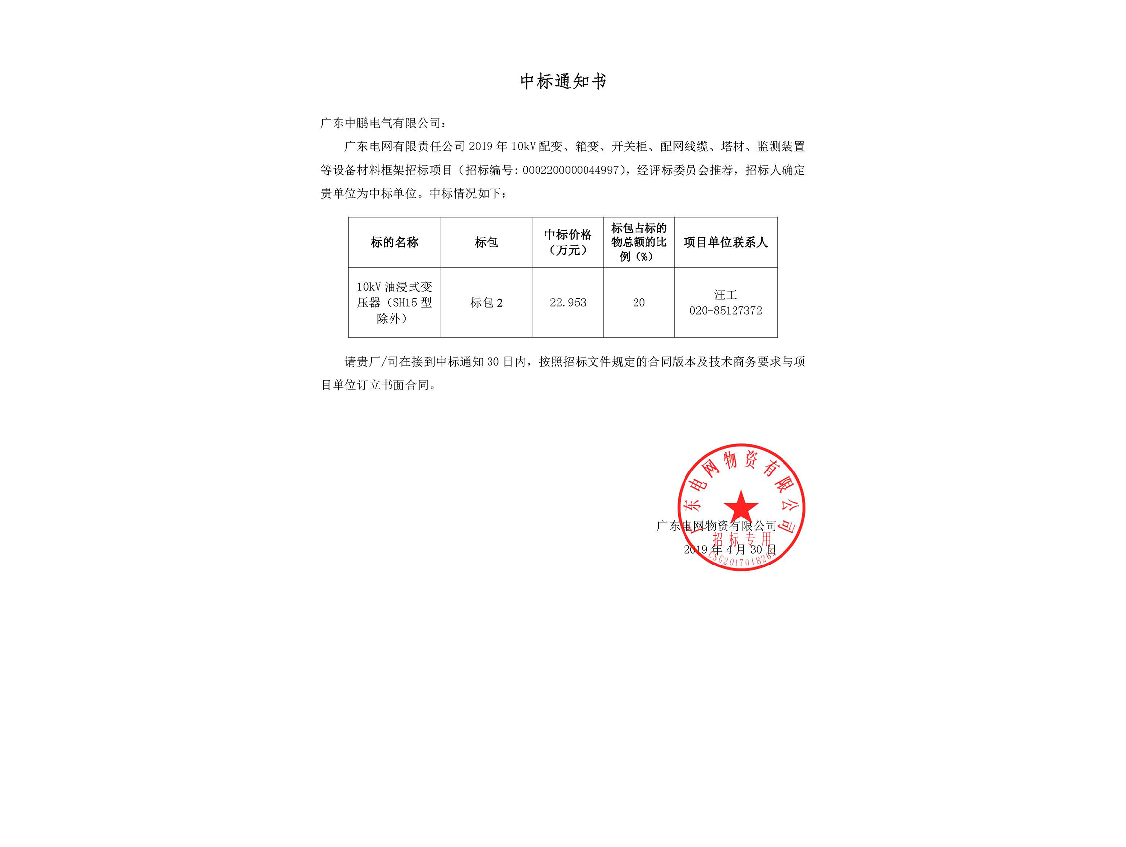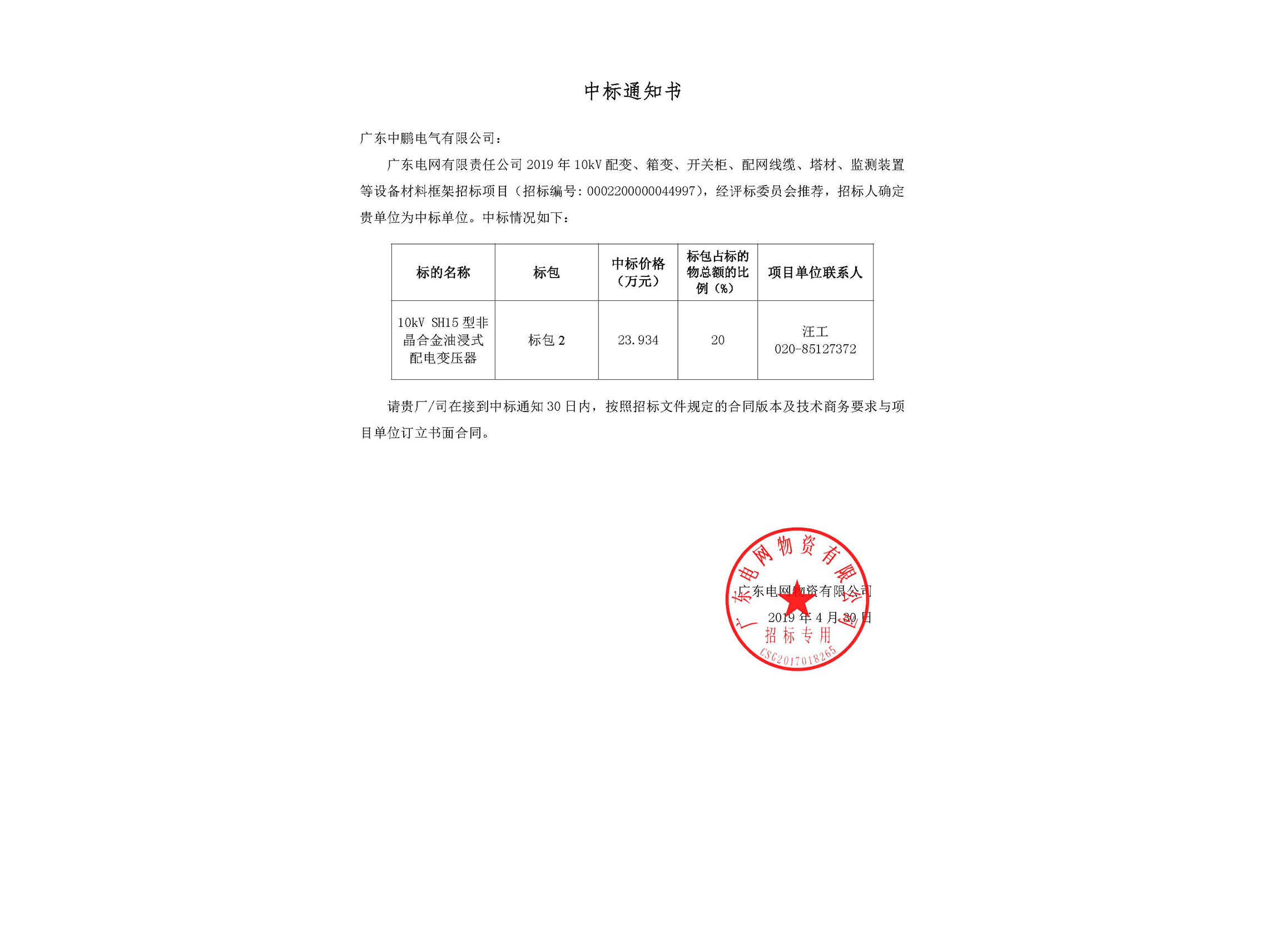 • Oil-immersed transformer - Notice of Winning the Bid-Guangdong Power Grid